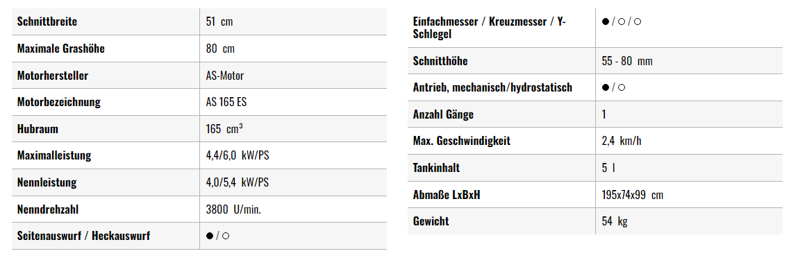 Der Klassiker unter den Allmähern mit 3-Rad-Konzept. Der AS 21 2T ES ist ein Wiesenmäher mit dem weltweit einzigen 2-Takt-Motor, der die geltende EU-Abgasrichtlinie 97/68/EG erfüllt. Da die Motorschmierung mit dem AS-2-Takt-Motor lageunabhängig erhalten bleibt, sind selbst Arbeiten an Schräglagen mit bis zu 45 Grad und mehr möglich ohne einen Motorschaden zu riskieren. Die Grenze des Einsatzes wird nur durch die Arbeitssicherheit des Benutzers gesetzt. Der AS-2-Takt-Motor ist zusätzlich standardmäßig mit einer EasyStart-Funktion ausgestattet. Das digitale Zündsystem CDI halbiert die für den Start erforderliche Drehzahl, sodass sich der Wiesenmäher sehr leicht starten lässt. Zusätzlich wird die Luft für den Motor über den serienmäßig verbauten, hochgelegten Schnorchelfilter angesaugt und der Motor somit mit staubfreier Luft versorgt. Die für den 2-Takt-Motor typischen hohen Drehzahlen und das hohe Drehmoment sorgen auch bei höherem Gras für volle Leistung. Die dritte Kurbelwellenlagerung in Verbindung mit der Reibscheibe am Flügelmesser bietet Motorschutz bei Kollissionen mit Fremdkörpern. Für guten Vortrieb sorgen die profilierten Antriebsräder bei einer Geschwindigkeit von 2,8 km/h.