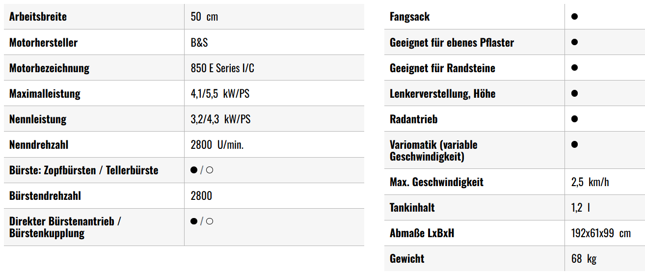 Die Arbeitsweise der AS 50 WeedHex ist durch einen fliehkraftgeregelten Anpressdruck der Bürsten schonend und gleichmäßig. Mit einer Arbeitsbreite von 50 cm liegt ihre maximale Flächenleistung bei rund 1.000 qm pro Stunde. Ihr 25-Liter-Fangsack nimmt entferntes Unkraut sicher auf. Wildkrautentfernung und Sammeln werden somit automatisch in einem Schritt umgesetzt. Beste Ergebnisse erzielt die AS 50 WeedHex auf ebenem Pflaster, Rasengittersteinen und entlang von Kanten und Randsteinen. Für die Reinigung von mineralischen Oberflächen und unebenen Pflastern ist sie nicht geeignet. Ihr doppelter Steinschlagschutz (DPLF-Zertifiziert) hält auch bei Rangiermanövern umherfliegende Steinchen oder größere Pflanzenteile sicher im Zaum. Außerdem sorgt er für einen sehr geräuscharmen Betrieb. Durch das Gewicht von 70 kg und die kompakten Transportmaße lässt sich die AS 50 WeedHex leicht und bequem transportieren.